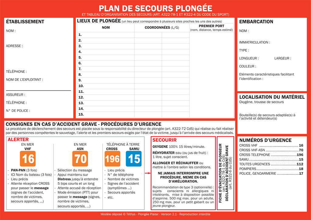 Le plan de secours est un document écrit, adapté au lieu et à la plongée pratiquée, régulièrement mis à jour et porté à la connaissance du directeur de plongée, des personnes encadrant les palanquées et des plongeurs autonomes. Il précise notamment les modalités d'alerte en cas d'accident, les coordonnées des services de secours et les procédures d'urgence à appliquer en surface à la victime.